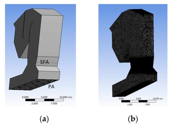 In this study, the new coupling approach was adopted to simulate a large scale WTE facility and the predictions were compared with real measurements from this facility under various operational scenarios. The geometry of the WTE incinerator is shown in Figure 6a,b. The computational domain was meshed by the ICEM-CFD and discretized into 7,959,512 unstructured cells. In the simulations, the primary air was preheated to 483 K and then discharged from 10 primary air zones (PA), while the secondary air was supplied with the temperature of 303 K to 313 K from the secondary nozzles at the front (SFA) and rear (SRA) walls. The mass flow rate for the PA, SFA and SRA were 11.9, 1.42 and 2.18 kg/s, respectively. The flow rate and temperature of the PA, SAF and SAR can be found in Table 1. The RNG k-ε closure with standard wall function was chosen for the turbulence model.