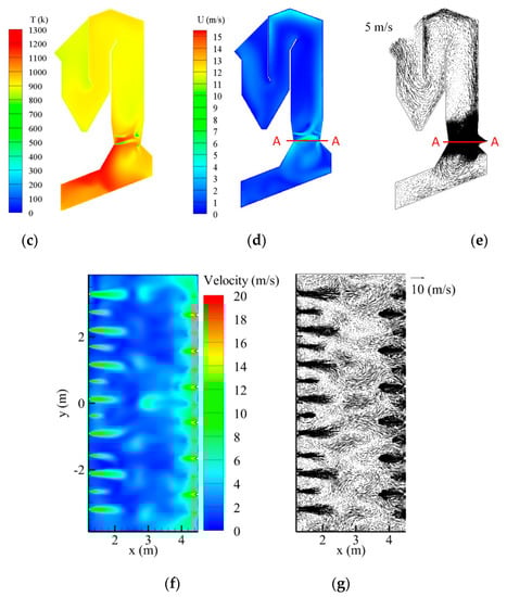 From Figure 6c, the temperature was predicted to increase from 1110 to 1400 K due to the chemical reactions and thermal convections, which was consistent with the field measurements of ~1373 K. The combustion mainly occurred in the region between the bottom and secondary jets. The temperature near the front wall side was higher than the rear wall side.