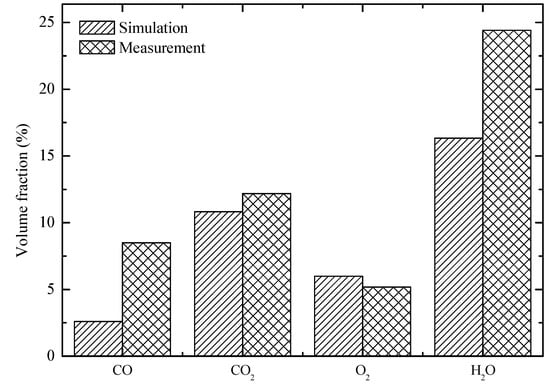 Figure 7 illustrates the volume fractions of the gas emissions at the outlet. The results showed that the predictions from the simulation were close to the measurements. Considering the complexity of the waste composition and the varying operating conditions in the WTE plant, the present predictions were deemed to be satisfactory. At the same time, the volume fraction of CO was evidently lower than the field measurements, which demonstrated that further improvement in the coupling model was necessary in the future. It should be noted that the predicted temperature of the gas emission (900 °C) at the exit was much higher than the field measurement (190 °C) due to the fact that the heat exchange zone for power generation at the top of the incinerator was not included in the simulation. However, the omission of this heat exchange zone did not significantly affect the simulation inside the incinerator.