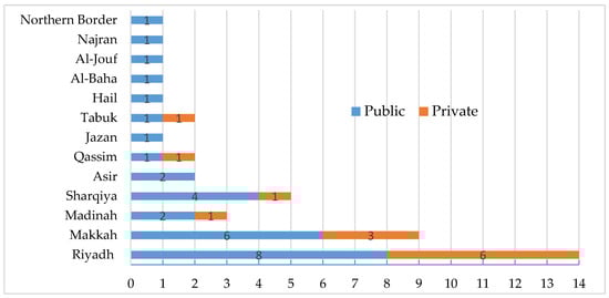 According to the UNESCO, education for SD at HEIs “fosters a process of learning how to make decisions that consider the long-term future of the economy, ecology, and equity of all communities” [57]. For higher education to play this vital role, first, there is the need to consider the number and spatial distribution of HEIs in the community to guarantee equitable access. Second, SD should be an integral part of the mission of HEIs in the community. This section, therefore, assesses (a) the distribution of universities in Saudi Arabia and (b) the extent to which the universities have an institutional framework to guide and foster their SD efforts: SD visions/missions and plans; SD governance; SD guidelines, assessment, and reporting; and networking and partnerships for SD.