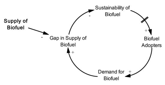 Demand and supply are the primary actors in the diffusion of algal biofuels. The initial supply and the growth rate of supply are critical in facilitating the adoption of this energy source. Likewise, for any product, if the provider (of algal biofuels) fails to secure all demand, competitors (other energy sources, including the current energy source being patronized by the industry) may service the demand. Figure 4 demonstrates this as a causal loop diagram, according to the system dynamics methodology. The consequence of this for biofuels is that the supply gap may discourage potential and current adopters. This would put to waste the existing biorefineries and resources invested in biofuel production.