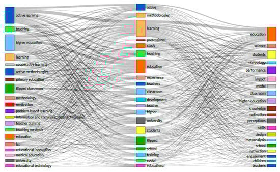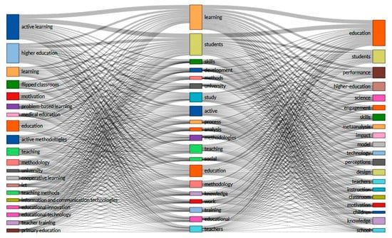 In Figure 1, relationships are observed between the 20 main author keywords (left field), 20 keywords inferred from article abstracts (middle field), and 20 keywords plus (right field). It can be appreciated from this combination of three variables that the terms with highest agreement values are those of “education” with 1044, “active learning” with 1013, “learning” with 1001, “students” (from keywords inferred from article abstracts) with 884, ”higher education” with 797, and “students” (from keywords plus) with 544. With regards to relationships between terms, we found the highest flow values to pertain to “active learning—students” with 183, “students—education” with 173, “active learning—learning” with 170, “learning—education” with 156, and “higher education—students” with 116.