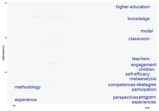 As can be seen in Figure 3 and Figure 4, some of the most frequent trending topics do not provide information on specific aspects of education. This applies in the cases of “education”, “higher education”, or “methodology”. This responds to universal concerns that education has maintained for decades and that remain perennial over time, since they are general and inherent themes of the discipline both in the field of practice and in educational research. However, one can also see other trending themes, such as “motivation”, “classroom”, “knowledge”, “experience” or “ict- information and communication technologies”, that may be marking a turn, as will be seen later with the analysis carried out, in favor of a digital teaching–learning context with a great presence of technology, and where the traditional models in which the classroom was conceived, the knowledge, or the motivation of the students undergo a transformation according to the current times and demands.