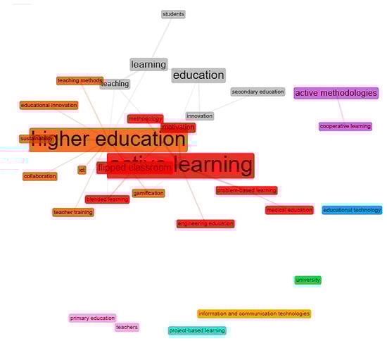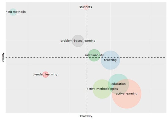 Taking as a reference the quadrants of the Cartesian axis, we find that the upper left quadrant (quadrant 3) refers to highly specialized and isolated themes. The lower left quadrant (quadrant 4) pertains to marginal themes or those that are in decline. The upper right quadrant (quadrant 1) relates to motor themes, and the lower right quadrant (quadrant 2) pertains to emergent themes [44]. In accordance with that previously stated, we can see that the nine largest bubbles or clusters obtained from analysis of authors’ keywords correspond to emergent themes, such as “active learning”, “active methodologies”, “education”, and “teaching”. These clusters are central and, although they consist of a greater number of themes in their formation, they have less dense internal links. The bubble corresponding to “active learning” is composed of 16 keywords, with the following terms obtaining the greatest occurrence values: “active learning” with 55, “higher education” with 44, “flipped classroom” with 20, and “information and communication technologies (ICT)” with 15. Five keywords are grouped within the frontier of “active methodologies”. These are “active methodologies” with an occurrence value of 20, “educational technology” with 8, “cooperative learning” with 7, “engineering education” with 7, and “technology” with 5. For the bubble denominated “education”, four keywords are included, these being “education” with an occurrence of 26, “learning” with 20, “university” with 7, and “curriculum” with 7. Finally, the “teaching” cluster is composed of another four keywords, which are “teaching” with an occurrence of 16, “motivation” with 13, “methodology” with 12, and “creativity” with 5.