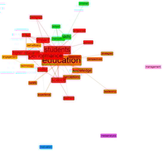 In the co-occurrence network of keywords extracted from keywords plus, seven clusters were established, with the first cluster (red) including the terms “students”, “performance”, “impact”, “model”, “science”, “higher education”, “teachers”, “design”, “pedagogy”, “enterprise”, and “schools”. The second cluster (blue) comprises the term “motivation”. The third cluster (green) includes the terms “skills”, “instruction”, “school”, and “children”. The fourth cluster (purple) comprises the term “meta-analysis”. The fifth cluster (orange) includes the terms “technology”, self-efficacy”, and “engagement”. The sixth cluster (brown) includes the terms “education”, “knowledge”, “classroom”, “perceptions”, “experience”, “leadership”, “beliefs”, “strategies”, and “perspectives”, and the seventh cluster (pink) comprises the term “management”. Within this co-occurrence network of keywords established using keywords plus, the three most relevant nodes are found to be located in the most central part of the graph. Firstly, the topic “education” stands out due to its large size. This topic belongs to the brown cluster, which is one of the central clusters and the second least dense cluster, as it comprises only eight topics. The other two most important nodes, according to size, are the topics “students” and “performance”. Both belong to the red cluster, which, at the same time, forms another large central cluster and is also seen to be less dense, with a maximum of only 11 topics being housed within it. Although, as occurred with the network in Figure 5, the size of the links turns out to be largely similar for the keywords plus network. For this reason, equality exists in the strength of relationships between topics. However, in some specific cases, a thicker link can be seen, with a greater strength consequently being seen in the relationships between terms, such as between “education” and “science”, “beliefs” and “education”, and “impact” and “students”. With regards to the topics that present a value of betweenness centrality greater than 0 and, thus, execute greater control over the network, outcomes are as follows: “education” with 115.21, “students” with 80.01, “performance” with 54.24, “skills” with 31.71, “knowledge” with 26.90, “impact” with 9.79, “classroom” with 4.55, “model” with 4.41, “science” with 3.96, “technology” with 3.24,“ self-efficacy” with 2.43, “instruction” with 1.95, “higher education” with 1.38, “perceptions” with 0.71, “engagement” with 0.61, and “teachers” with 0.13. The remaining topics had betweenness centrality values of 0.