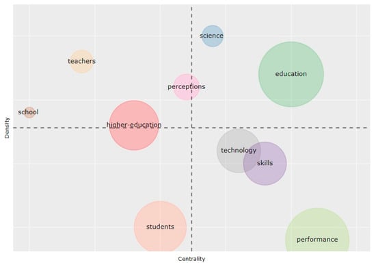 In this section, some specific aspects can be pointed out. In the first place, the fall from the topic “students” to the so-called marginal or declining topics is striking. On the other hand, the bubbles related to “technology” and “skills” stand out, such as those that mark the new emerging themes. This fact could be interpreted from the point of view in which the incursion of technology in the educational field is increasing, and the research focuses more on the methodological challenges that these changes entail within an educational digital context rather than the aspects related to the students, even though these remain the cornerstone of the teaching–learning process.