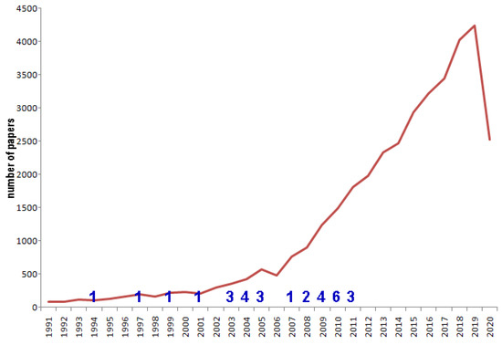 Dynamics of publishing papers dealing with the relationship between climate change and agriculture (brown line—all papers, blue numbers—the number of the most-cited papers by years). The information for 2020 is strongly incomplete, which explains the sharp drop.