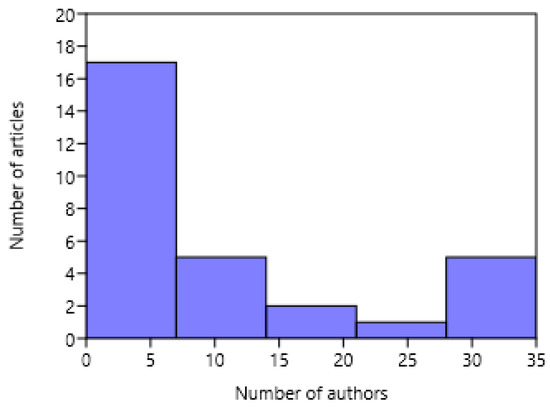 Frequency distribution of the author teams size in the considered articles.
