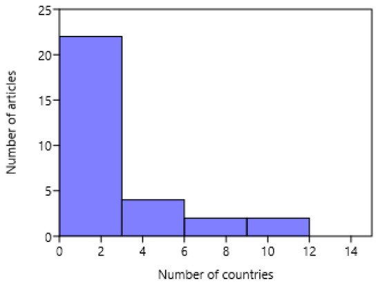 Frequency distribution of the number of countries indicated in author affiliations in the considered articles.