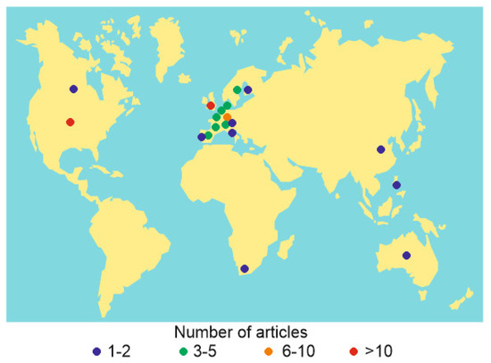 Of big interest is how international (in regard to the authors’ affiliations) was the research that resulted in the most-cited articles. The bibliographical information allows ambivalent judgments (Table 1). On the one hand, many articles were written by the representatives of one–two countries (often, these are the UK and the USA) (Figure 4). On the other hand, there are articles authored by truly international teams (Table 1), and experts from a total of 19 countries authored the considered articles taken entirely (Figure 5). One should also note that the authors represent chiefly Western Europe and North America (Figure 5). Generally, it appears that the most-cited articles dealing with the relationship between climate change and agriculture resulted from the limited collaboration of experts representing different countries (when existing, this is chiefly North American–European collaboration). Notably, international collaboration does not affect the number of citations, because the correlation coefficient between the number of countries indicated in the author affiliations and the number of citations is very low (0.08 in the case of total citations and 0.09 in the case of average annual citations).