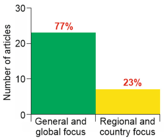 The most-cited articles are either of a general nature and address planetary-scale issues or region- or country-focused. The former prevail, which is expected (Figure 6). Moreover, it is surprising that there are some papers focusing on particular countries and, nonetheless, attracting such a big number of citations. This means that there are issues of outstanding importance that can be analyzed deeply on the basis of case examples. The papers with a regional or country focus deal with the USA, Brazil, all of Europe, and China.