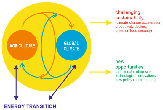 The agriculture–climate change relationship has an important dimension that requires special attention, also in regard to the reviewed literature sources. Energy transition is a fundamental and multidimensional problem of modern civilization [50,51,52,53,54]. Particularly, its solution is aimed at sustainable development of energy systems and industry in the whole, broad implementation of clean, innovative energy-related technologies, more attention to renewable energy sources, etc. Undoubtedly, the energy transition is not only important with regard to the global climate change and sustainable world agriculture (and food security), but it is strongly related to these two planetary-scale issues. The direct relevance of energy transition to the global climate change and the policies of its mitigation on municipal, national, regional, and global levels is explained by Hoppe and van Bueren [55], Fazey et al. [56], Newell and Bulkeley [57], Scheffran et al. [58], and Urban [59]. The strong relation of agriculture to the energy transition is also discussed. Probably, the most important contribution was made by Sutherland et al. [60] who explain how management of land and ecosystems in agriculture relates it to the renewable energy transition, although this requires significant policy support; moreover, these specialists note that agriculture competes with the electricity industry over access to natural resources. Importantly, this study also demonstrates the full complexity of the energy–agriculture–climate change nexus.