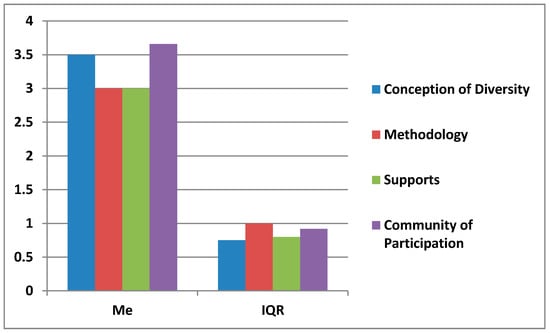 In relation to the first dimension “Conception of diversity”, the participants in the study show a score Median (Me) = 3.5 (IQR = 0.75). The scores are similar for men and women MeMen = 3.5 (IQR = 1), MeWomen = 3.5 (IQR = 0.75), with no significant differences observed when comparing between sex (p = 0.64), nor by degree (p = 0.14). With respect to the items that make up this first dimension, the highest scores (greater synchrony with an adequate conception of diversity) were obtained in “I would prefer to have students with specific educational support needs in my classroom” (Me = 4; IQR = 1; degree (p = 0.23); sex (p = 0.11)), “A child with specific educational support needs does not disrupt the classroom routine and disrupts the learning of his or her peers” (Me = 4; IQR = 1; degree (p = 0.21); sex (p = 0.59)) and “I am not concerned that my workload will increase if I have students with specific educational support needs in my class” (Me = 4; IQR = 1; degree (p = 0.51); sex (p = 0.87)). However, a lower score was obtained for the item “Students with specific support needs can follow the day-to-day curriculum” (Me = 3; IQR = 2; degree (p = 0.16); sex (p = 0.59)).