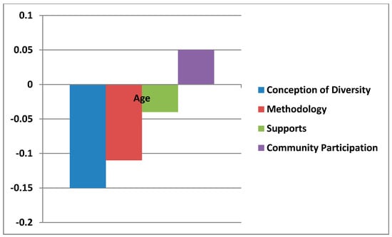 Figure 3 show the correlations between the different dimensions of the CEFI-R questionnaire and age. The results indicate that in dimension 1 “Conception of diversity”, there is a significant low and inverse correlation with age; as the age range increases, the dimension 1 score decreases (ρ = −0.15;
