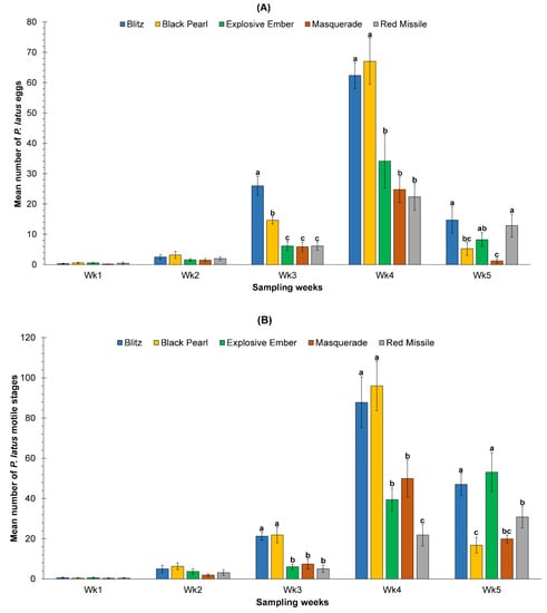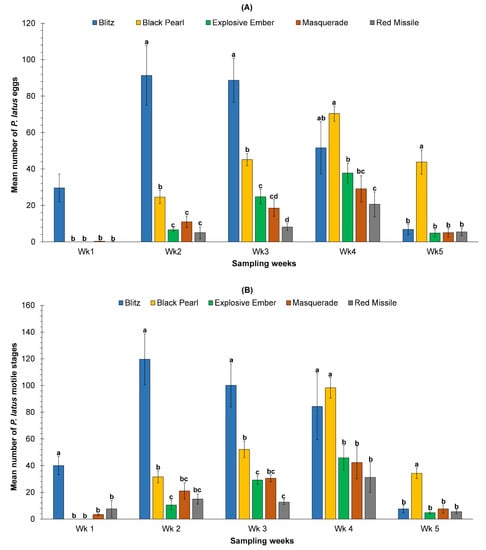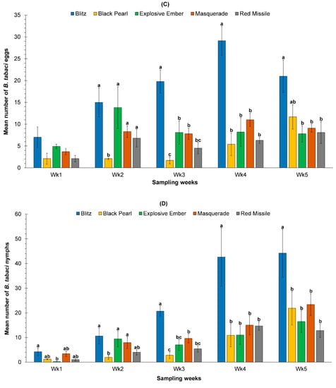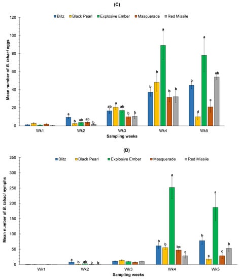 Mean numbers (± SEM) of (A) Polyphagotarsonemus latus eggs and (B) motile stages, (C) Bemisia tabaci eggs, and (D) nymphs recorded weekly per five leaves of a pepper cultivar (Blitz: BL; Black Pearl: BP; Explosive Ember: EE; Masquerade: MA; and Red Missile: RM) per replication in choice tests.