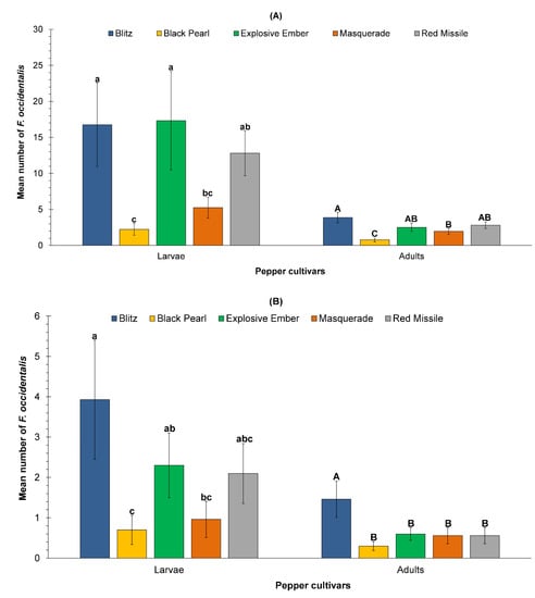 To assess the preference of F. occidentalis among five pepper cultivars, a choice test was conducted in the greenhouse with environmental conditions as described above. The method of plant propagation, spatial arrangement for the experiment, and method of evaluation were similar to those described in the above experiment, except that the sampling unit was three flowers per replicate. Flowers were collected weekly and placed in 50 mL Falcon™ tubes containing 75% ethanol. Thrips were extracted from the alcohol by using a USA Standard Testing sieve with a 25 µm mesh grating (W. S. Tyler, Inc., Mentor, OH, USA) following the protocol described in Seal and Baranowski [30]. The residue remaining in the sieve was washed off with 75% alcohol into a Petri dish, examined under a dissecting microscope at 12×, and the number of thrips larvae and adults were recorded.