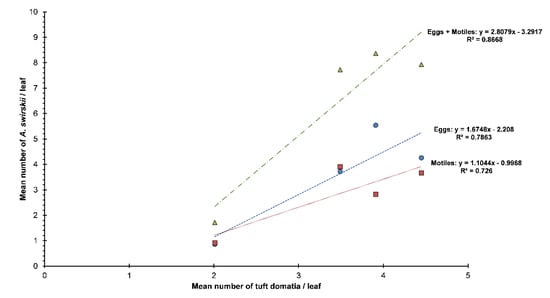 In the absence of prey, each cultivar sustained the A. swirskii populations throughout the study period. A significantly lower mean density of tuft domatia (F3,27 = 21.40; p < 0.0001) and number of A. swirskii (F3,27 = 4.11; p = 0.0159) were recorded for BP when compared to other cultivars. A positive correlation was found between the number of tuft domatia and the number of eggs (R2 = 0.786; y = 1.6748x − 2.208), motile stages (R2 = 0.726; y = 1.1044x − 0.9968), and total A. swirskii count (eggs + motile stages) (R2 = 0.867; y = 2.8079x − 3.2917) per leaf (Figure 4).