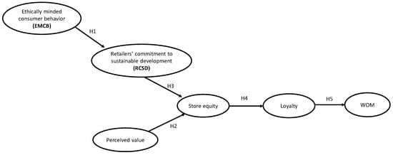 EMCB implies the consideration of environmental principles and social causes in the purchase decision, beyond the mere satisfaction of needs [], therefore tangible proof of the social, environmental, and economic commitment of retailers is expected []. In this sense, it is important to analyze the scope of the retailers’ commitment to sustainable development as perceived by consumers (hereinafter, RCSD), following the call for future research by Lavorata [], regarding its impact on consumer behavior in terms of loyalty and word-of-mouth communication.