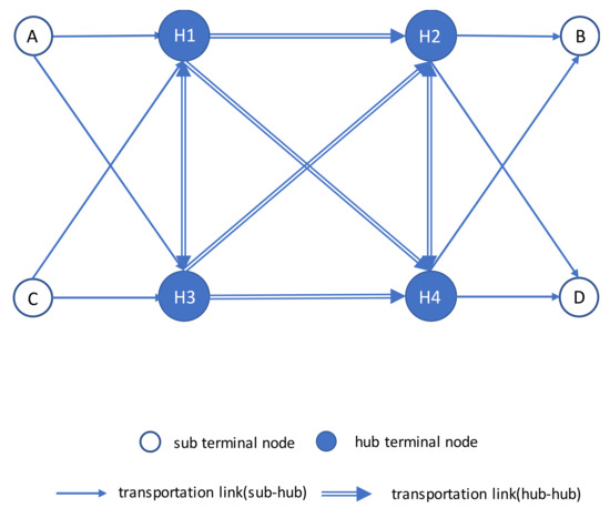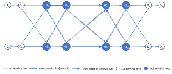Figure 6 illustrates our graph representation of Figure 1. A node for sub terminals is connected to hub terminals and is not permitted for direct transportation between sub terminal nodes, which reflects current logistic systems of the case study. Hub nodes are mutually connected with hub links. Back to the example of Figure 1, shipments having route (A-H1-H4-D) will be rerouted when the processing cost of a link () is so high due to excessive shipments to process that detouring to H3 is cheaper.