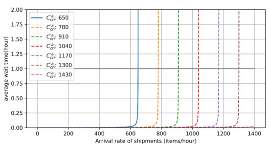 Figure 3 indicates the average waiting time according to the arrival rate of shipments () and the processing rate (. Let us assume that a terminal can process shipments at a rate of 650 items per hour. When the arrival rate of shipments approaches the current processing rate , the average waiting time of a shipment increases rapidly. If the arrival rate is higher than the processing rate, the possible solution is to increase the processing rate to handle the shipments in time. The dashed lines are examples of an average waiting time with respect to the shipment arrival rates. The intersection points between the black line at 1 hour wait time and the dashed line indicate the required processing rate to handle the shipments at the arrival rate of associated x points. For instance, to handle 770 shipments per hour in less than an hour, a processing rate () of 780 boxes per hour is required.