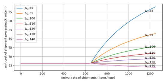 Figure 4 indicates how exceeded demands affect the unit shipment costs with respect to the processing rate of unscheduled work The processing rate of scheduled work () is assumed to 130 boxes per hour for the figure. If is the same with the processing rate of , the unit cost of handling shipment does not change. However, a lower increases the unit cost. The unit cost is a non-linear and non-convex function with respect to the arrival rate of shipments, therefore, it is impossible to have a global optimum solution for the mathematical problem with this function. Thus, we approximate the function into a piecewise linear function, which has the same mechanism as the rectified linear activation function, also known as ReLU. If an arrival rate of shipments is less than the critical service rate, the unit cost of terminal processing is a base rate. Otherwise, a processing cost increases linearly, as shown in Equation (19). is empirically determined from our experiments based on Equation (16).