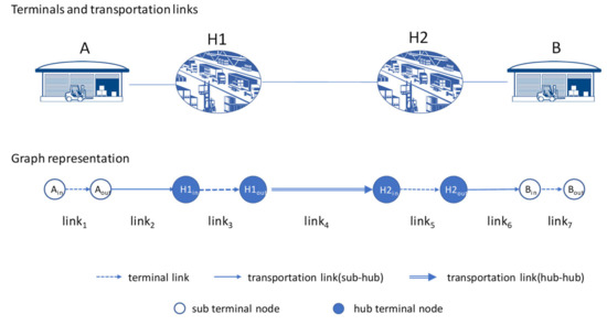 The proposed bi-level mathematical programming formulation is a non-convex problem, and the constraint set and the objective function are non-differentiable. However, the objective function and constraints are linear and differentiable. Note that even bi-level linear programming is an NP-Hard problem [28,29] and solving the proposed model is a challenging task. Converting mathematical programming into a graph helps to solve the problem. Figure 5 shows an example of the graph representation of the logistic system. There are four terminals (two terminals and two hubs) and three transportation links in the example. To consider the increased cost due to excessive demand, we also disaggregate a terminal node into a set of sub-nodes and a link, which is a simple schematic format of the processing flow of a logistic terminal as used in [3,7]. For instance, we convert the Hub 1 (H1) node into a link with a node for inflow () and a node for outflow, we use a tuple for a link (. Although the computational complexity increases due to the increased number of nodes, this representation enables us to find a path for minimizing total cost with dynamic costs for terminal processing and transportation simultaneously. Shipments origin from in-node and pass through a processing link of subterminal (link1) for transportation, as indicated in Figure 5. Shipments travel on links from 2 to 6 and arrive at the in-node of terminal B ().