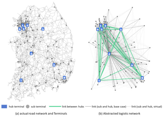 The proposed model is applied to a parcel delivery logistic system in Korea, which is shown in Figure 7. There are 9 hub terminals and 213 sub terminals. We used an actual road network shown in in Figure 7a to calculate travel distances of the shortest time path between terminals. Figure 7b is an abstract representation of the network, used in the mathematical formulation. The green line represents a line haul transportation link between hubs and the gray line indicates a link from hub to sub and sub to hub that are currently used as sub–hub terminal relationships. The links (dashed gray line) recharacterize the relationship between sub and hub terminals to minimize total cost, as shown in Figure 7. In addition, the abstract network also includes the processing link of terminals.