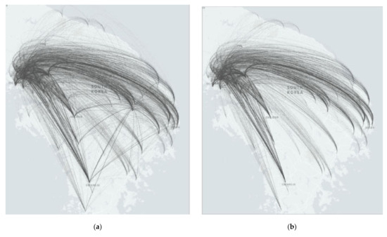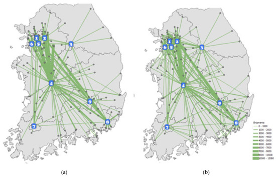 Figure 8 indicates the distribution of origin–destination shipments. Figure 8a represents the entire origin and destination demand, which indicates that a significant portion of shipments is associated with the Seoul Metropolitan Area (SMA). Busan, Daejeon, and Gwangju also have a large number of shipments, most of which also relate to SMA.