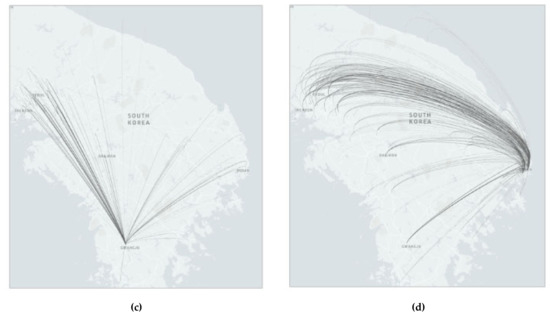 The Spatial Distribution of Origin–Destination Shipments. (a) Shipments OD volumes of Korea (b), Shipments from Seoul Metropolitan Area, (c) Shipments origin from Gwangju Metropolitan city, (d) Shipments origin from Busan Metropolitan city.