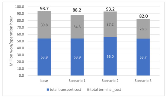 Figure 10 shows the results of the total cost of each scenario. The proposed method reduces the total cost from 93.7 KRW to 82 million KRW per operation hour. Most of the improvements in the total terminal cost come not only from the enhancement of the processing rate of selected terminals but also from the terminal selections. The proposed method allocates shipments to less congested terminals, thus ensuring that it utilizes the supply of terminals efficiently. Scenario 2 also decreases the total terminal cost by increasing the processing rate. Although Scenario 3 also improves the efficiency of the logistic system, applying only the routing strategy (Scenario 3) increases the total transport cost since some shipments are assigned to less congested terminals, thereby inducing longer travel distances. The routing strategy only finds a single route that is a minimum cost under the link conditions of terminal and transport. Besides, the sole routing strategy cannot guarantee the equilibrated solution: thus, the updated route may or may not induce congestion of the selected terminal, which cannot improve the efficiency of the logistics system effectively.