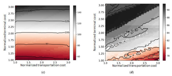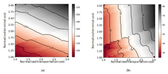 Sensitivity analysis aids in understanding how the model solution is affected with a change in its various inputs that might be either external or internal. In [32], the importance of the simulation-based sensitivity analysis is shown by randomly changing selected parameters functioning to logistic facilities. In our research, transportation cost and terminal cost are critical parameters in the optimization, which have a tradeoff relationship. For sensitivity analysis of the two parameters to the proposed model, we vary the transportation cost and terminal processing cost by a linear multiplication from 1 to 3 at intervals of 0.5, which generates a total of 1600 cases for the simulation analysis. For example, a value of multiplication factor 2 implies that the basic transportation cost and distance-based cost of a box are two times more expensive than the base case.