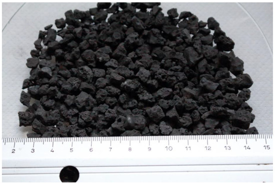 For aggregates (usually crushed rock), different lithotypes can be used during the preparation of the mixtures, including limestone, basalt, and porphyry. For each of these lithotypes, mixtures with different mechanical characteristics can be obtained. In this work, we evaluate a particular mixture of aggregates in which the coarse fraction (4–8 mm) is represented by steel slag (Figure 1), the fine fraction (0.063–4 mm) by limestone sand, and the filler (less than 0.063 mm) by cement dust. The average chemical composition of steel slag, represented in oxides, falls within the range shown in Table 1.