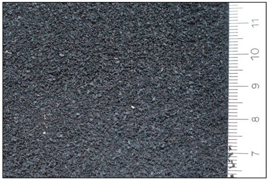 The second unconventional material used for preparing the mixture was crumb rubber (Figure 2). This material is the result of a reduction in the small grain size of exhausted tyres. Given the nature of the material, the material’s characteristics can vary according to the kind of tyre (i.e., for light or heavy vehicles). The crumb rubber is, therefore, composed of a mixture of different rubbers, both natural and synthetic. The proportion of these rubbers also depends on the type of tyre. For example, the natural rubber content of heavy-duty tyres is higher than that of light-duty tyres. In addition to the presence of rubber, the crumb also consists of a variable (albeit always negligible) percentage of steel and textile materials.