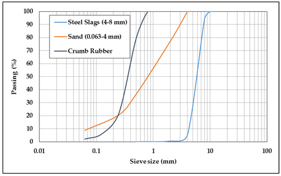 The aim of the study was to verify the mechanical improvements that can be achieved by adding a certain amount of crumb rubber to a bituminous mixture that contains steel slag. In this way, we analyse a bituminous mixture almost entirely produced with recycled materials. The steel slag has a particularly porous surfaces, so there is usually a need to increase the percentage of bitumen in the formulation of the mixture. For this purpose, two identical mixtures were prepared, with one of them altered via the addition of crumb rubber. Dynamic laboratory tests were carried out to assess their mechanical behaviour. The basic recipe of the mixture is represented by an asphalt concrete commonly used in the geographical area where the experiment was carried out (North-East Italy) called “traditional surface course” (AC). In this recipe, a quantity of recycled tyre crumb rubber, equal to 0.75% by weight, was added to the mixture (a value close to the amount considered best [17,18,19,20]) using the dry technique, thereby obtaining Asphalt Rubber (AR). The grain size of the crumb rubber corresponds to that of fine sand (see Figure 3, which also shows the grain size distributions of carbonate sand and steel slag).