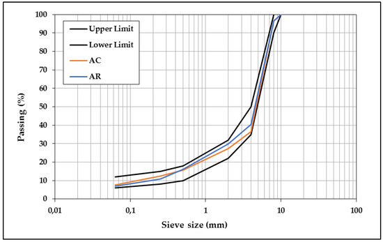 The percentage of bitumen in the mixture, expressed as the total weight of the aggregates, was 5.5% for both the AC and AR mixtures and was chosen using the Marshall methodology while optimizing the Marshall stability, the percentage of residual air voids, the compacted mixture density, and the indirect tensile strength.
