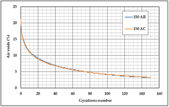 For the volumetric characteristics of the two mixtures, the specimens used to determine the mechanical characteristics were assessed after a compaction study with a gyratory press (Figure 5). The densification curves of the two mixtures, made for the test specimens with a diameter of 150 mm, were practically identical. To obtain samples with the same volumetric properties and a percentage of residual voids corresponding to that of the Marshall specimens, a number of revolutions equal to 100 (4% residual voids) was identified.