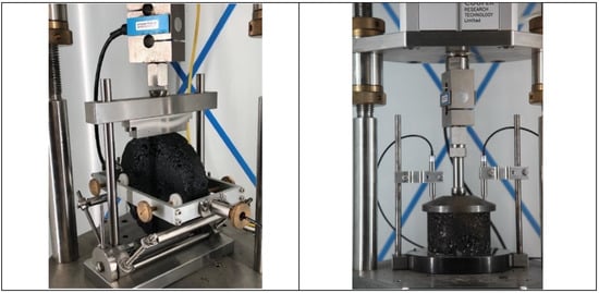 The resilient modulus is determined via a Repeated Load Indirect Tension test (RLIT, Figure 6) with cyclic loads according to UNI EN 12697-26, “Test Method for Hot Mix Asphalt Stiffness” [28]. The complex modulus is also evaluated with the same type of test (indirect tension) by applying a sinusoidal load that acts along the vertical diametrical plane to a cylindrical specimen. The diametrically induced tensile stress values and the measurement of the resilient strain define the complex modulus.