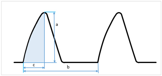 Form of the load pulse, UNI EN 12697-26: (a) peak load, (b) pulse repetition period, and (c) rise time.