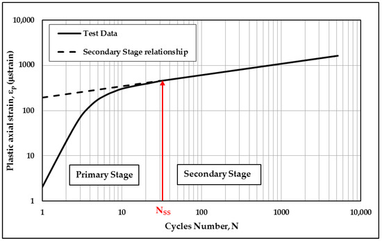 Parameter “a” represents the intercept at N (number of cycles), while “b” represents the slope of this line. Parameter “a” does not truly represent the deformation found in the first load cycle but derives exclusively from the characteristics of the second stage load with a constant slope.