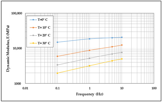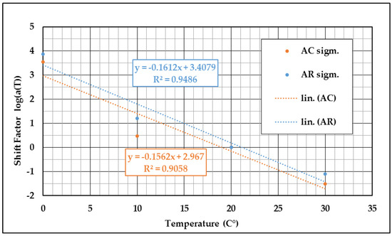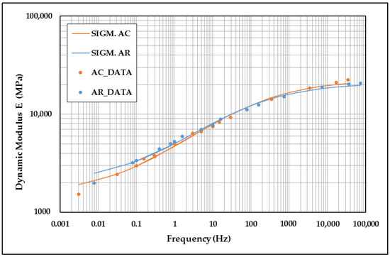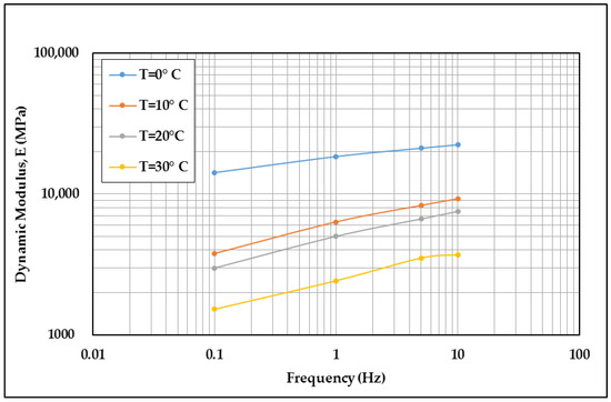 As the rheological behaviour of materials like asphalt is influenced by the temperature and frequency of the applied loads, to compare the results, we combined the modulus values at different test frequencies into a single continuous master curve [30]. This single curve was obtained by choosing a reference temperature and translating the modulus values obtained at the other test temperatures horizontally. The correlation between frequency and temperature is expressed by the “shift factor” parameter. This parameter provides a measure of the amount of data translation, in terms of frequency, that must be performed to obtain a single master curve. For the construction of the master curve, the function of sigmoidal correlation was used (see Equation (5)) [31,32] alongside optimization of the minimum squares at the reference temperature of 20 °C: