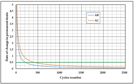 In this study, Nss, the number of cycles at which the primary section of the curve ends and the secondary section begins, was equal to 500 cycles with a gradient of variation less than 0.5 for the cumulative permanent deformations (see Figure 16). Figure 17 and Table 9 show the functions interpolating the secondary tract and the parameters of the equations.