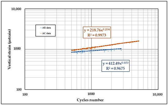 Secondary section of vertical strain vs. cycle number relationship, for AR and AC samples.