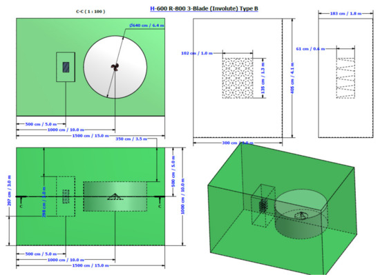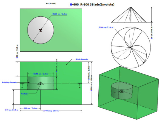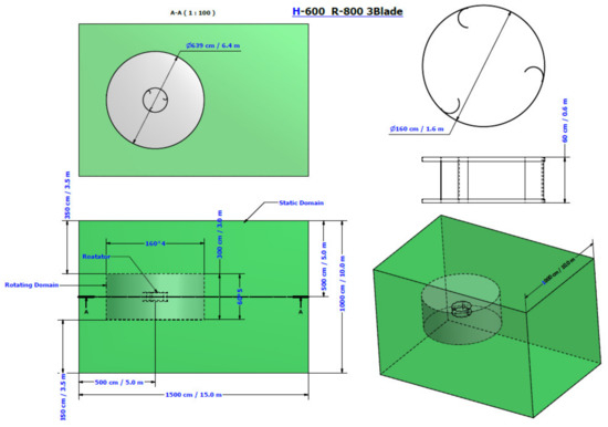In this case, three C-shaped blades are placed 120 degrees from each other with a chord length (C) of 0.013 m, a blade height of 0.6 m, and an aspect ratio of 0.75 in a standard H-type straight-bladed VAWT model, as shown in Figure 1. The geometrical values of the rotor are listed in Table 1. Further, the solidity (σ) calculated for this drag-type rotor model is 0.05. Additionally, the simulation setup consists of a stator domain (15 × 10 × 10 m size), rotor domain diameter (6.4 m), and 3 m height [30]. The complete geometry set up of the H-type rotor is demonstrated using AutoCAD and is given in Figure 2. The developed geometry is adapted in the ANSYS Fluent design modeler to study its performance.