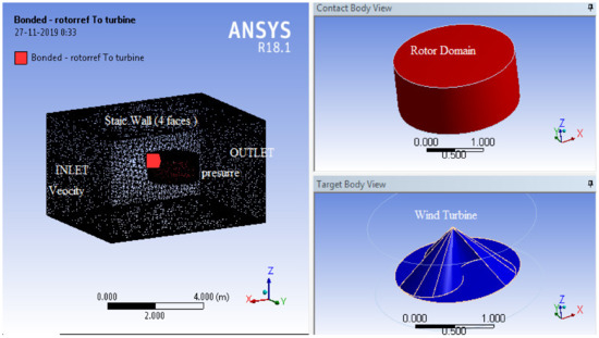 The computational domain consists of the stator domain, rotor domain, and wind turbine. The stator domain consists of a velocity inlet and pressure outlet with static wall surfaces and dimensions as shown in Figure 2, Figure 4, and Figure 6. The rotating domain consists of a wind turbine placed with + Z-axis (Figure 7). The length of the stator domain is fixed as 10D and width as 8D of the turbine diameter D [27]. The inlet is fixed with 2 m/s wind velocity, and the pressure outlet is fixed with zero pascal excess pressure assumed constant pressure at the outlet for all three cases. The rotating domain and turbine are bounded in a sliding mesh contact zone, and a suitable interface zone is also created to simulate the wind turbine rotation in different angular velocities (ω). In this configuration, the rotor domain is considered as a contact body and the wind turbine acts as a tool body.