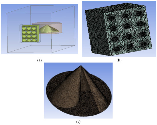 The physical configuration and simulation parameters are similar to the previous case, but there is an addition of WFM placed in front of the VAWT model in the direction of the wind velocity inlet. It consists of 0.6 m diffuser tubes with 0.3 m diameter towards the inlet side of the static domain and 0.15 m diameter towards the turbine side. The diffusers are arranged in a stack of 4 rows and 3 columns with decreasing diameter towards the VAWT Model. The decreasing cross-sectional area for wind flow in the tubes increases the pressure so that it accelerates wind velocity in the direction of wind flow. This simulation study carried out with rectangular-type WFM catches the wind from the proposed direction, and a circular-type WFM could be a future scope analysis, as it can catch wind from all directions. The physical description of rectangular and circular WFM are shown in Figure 5a,b.