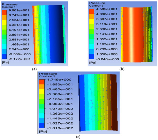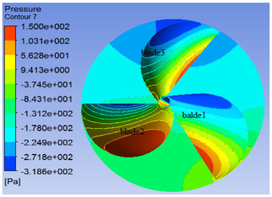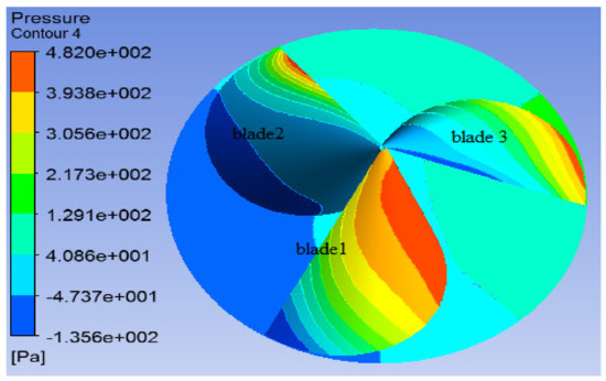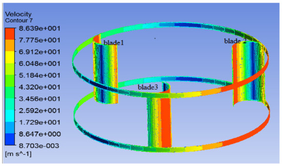 In this configuration, the rotor with WFM generates high and low pressure of about +150 and −318 Pa, respectively, as presented in Figure 22. Further, the velocity range exerted on the rotor is about 16.57 ms−1, resulting in a higher torque rate compared with previous case studies (Figure 23).
