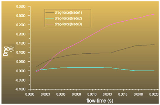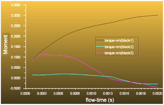 In a C-blade turbine, Blade 2 generates high pressure of +99.6 Pa, and Blade 1 generates −21 Pa, as shown in Figure 12. Therefore, high velocity is attained at the tip of Blade 1, as presented in Figure 13, which consequences the highest torque exerted on it. However, the resultant drag forces cause the rotor to rotate in a counterclockwise direction, that is, from Blade 2 to Blade 1, as per the direction shown in Figure 14. It shows that the lift forces are perpendicular to wind velocity and the drag forces in the direction of relative wind velocity. The moment value from the simulation results is obtained to study the torque characteristics of the blades and the turbine, which is measured from the reference +Z rotational axis. It is found that Blade 1 generated the maximum moment of 0.3 at a low negative pressure (Figure 15). In contrast, the other two blades generate negative momentum, and hence reduce the net resultant torque. This might be one of the important reasons for the low power generation from drag force-based wind turbines.