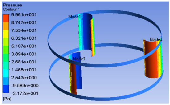 The C-blade profiles are exposed to the –X axis velocity inlet direction. Further, the profiles are studied through the pressure contours, and drag and lift forces exerted on the blades are studied at 60 rpm angular velocity, which is equivalent to 5 m/s (linear velocity for the corresponding diameter). Since this configuration consists of an optimal three-blade turbine, the individual pressure and velocity performance of each blade is performed below.