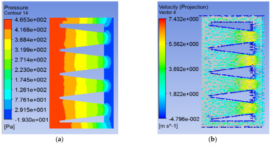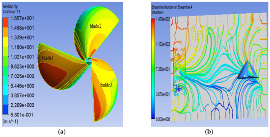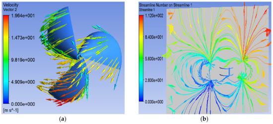 In this case, involute rotor blade 1 generates high pressure of +480 Pa and low pressure −135 Pa at Blade 2, as shown in Figure 17. This results in a high velocity of about 15.34 ms−1, as illustrated in Figure 18a, and high torque at Blade 2.