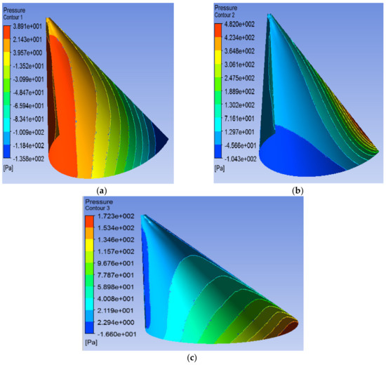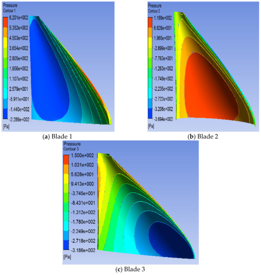 Blade 1 (a), blade 2 (b) and blade 3 (c). C- shaped H- type pressure contours.